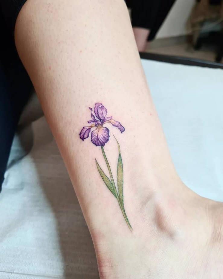 For a showstopping finish, a large purple iris on the back looks almost lifelike—the shading and depth are next level. It’s dramatic, luxurious, and the kind of tattoo that makes you feel deliberately beautiful whenever you catch a glimpse.