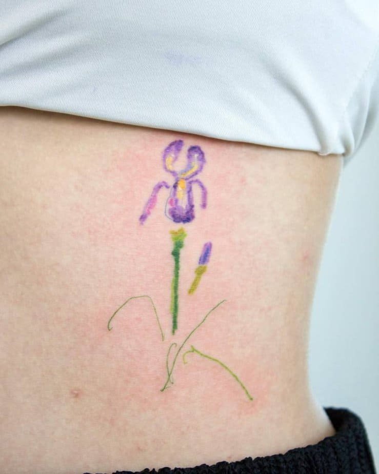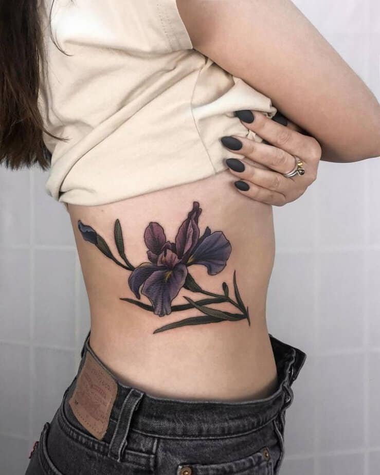 Small, delicate, and tucked away—an iris on the ribs is like a private keepsake. It’s easy to hide or reveal depending on your mood, which makes it feel a little secret and a lot personal.
