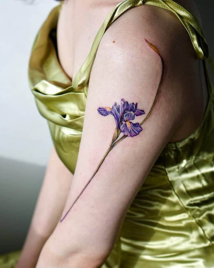 If you like attention in the best way, this long-stemmed, vividly colored iris on the upper arm is calling your name. The placement makes it easy to show off, and the scale gives the tattoo a presence that won’t get lost. Wear a tank top and let it do the talking.