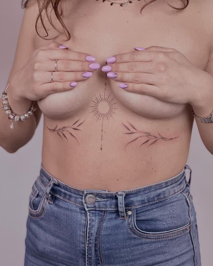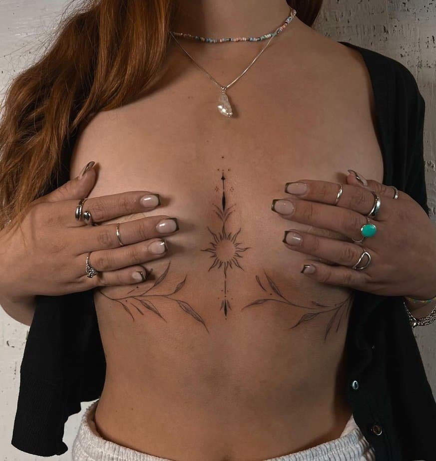 Botanical tattoos — leaves, branches, and natural motifs — are a gentle, organic way to frame your sternum. They feel effortless and alive, and they usually leave you smiling when you look in the mirror.