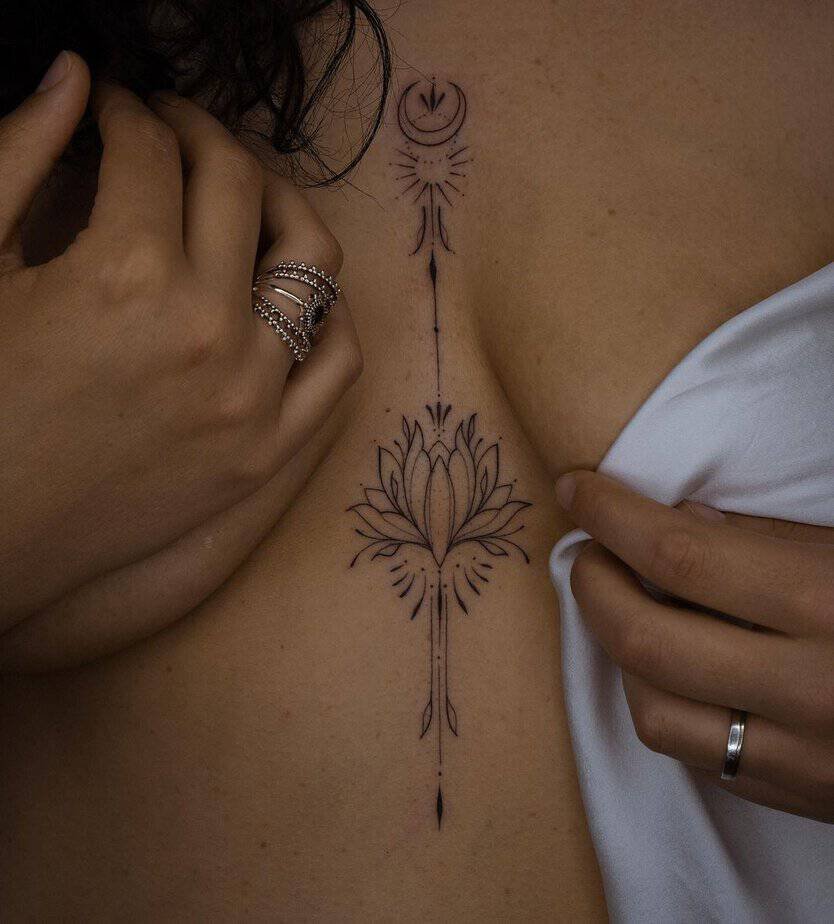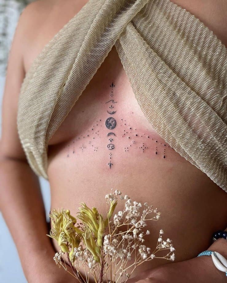 Ornamental tattoos are a favorite for good reason: they let you mix shapes, textures, and meaning. Add moon phases if you’re into the mysterious, cyclical vibe — it’s subtle but full of symbolism, and it looks gorgeous nestled under the sternum.
