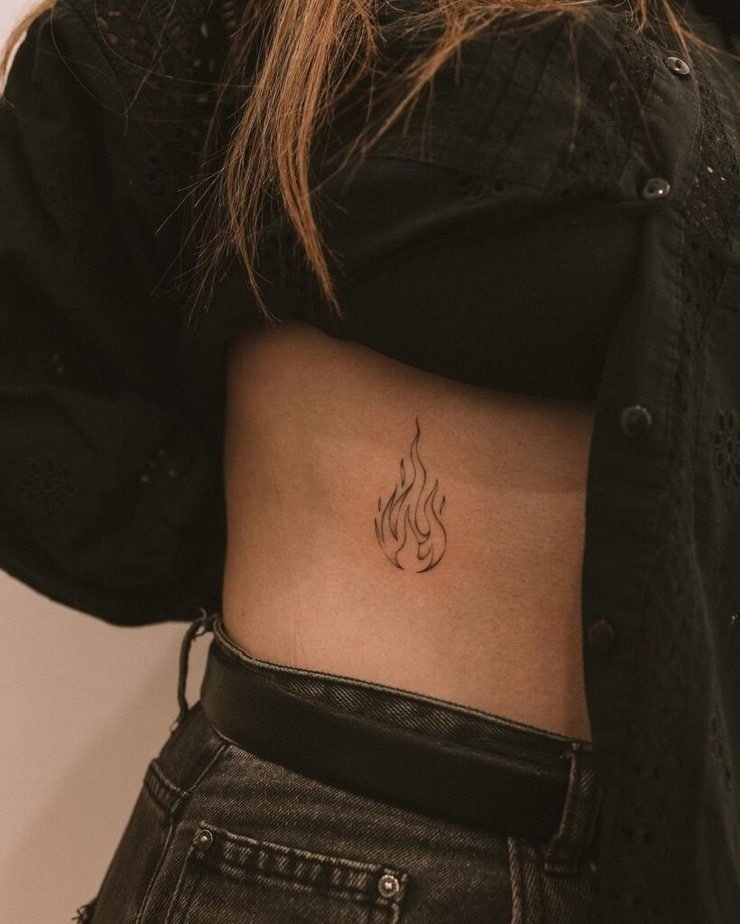 Flame tattoos can mean so many things — life, death, creativity, remembrance — pick whichever story fits. A small flame on the side of the stomach is spicy and private, and you get to assign it whatever meaning you want.