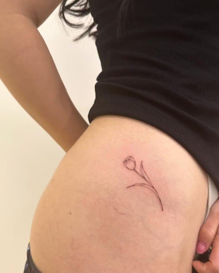 Tulips are clean and optimistic — they read as growth and prosperity. A small tulip on the hip feels feminine and a little secretive, which I adore. It’s the kind of detail that makes you smile in the mirror.
