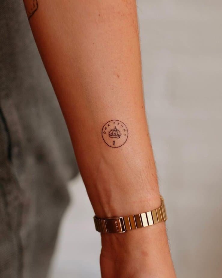 Penny tattoos are playful and kind of magical — a little symbol of luck, prosperity, or whatever story you assign to it. Tiny and quirky, it’s an adorable choice for a wrist spot.