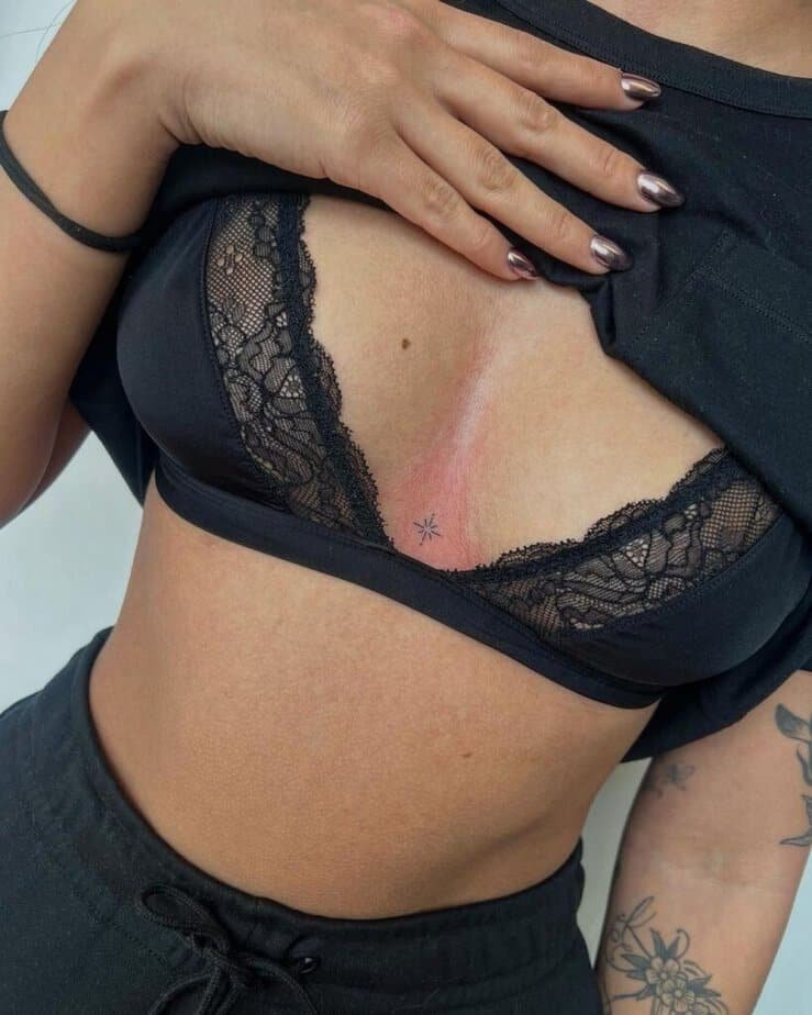 Sternum tattoos sound intimidating, but a single sparkle is quick and surprisingly wearable. It’s a tiny center-of-chest detail that feels intimate and a little bold without being overwhelming.
