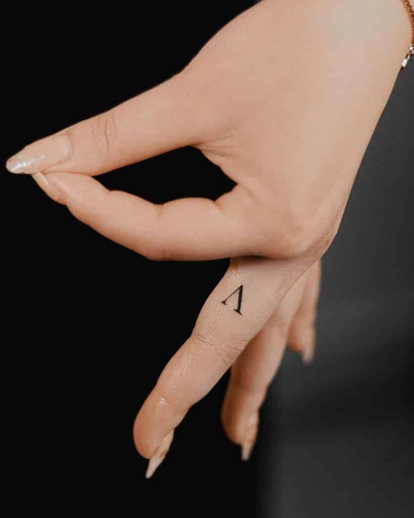 One letter can mean a million things. First letter of your name, someone you love, or a private reminder — a tiny finger letter tattoo is delicate and significant in a quiet way.
