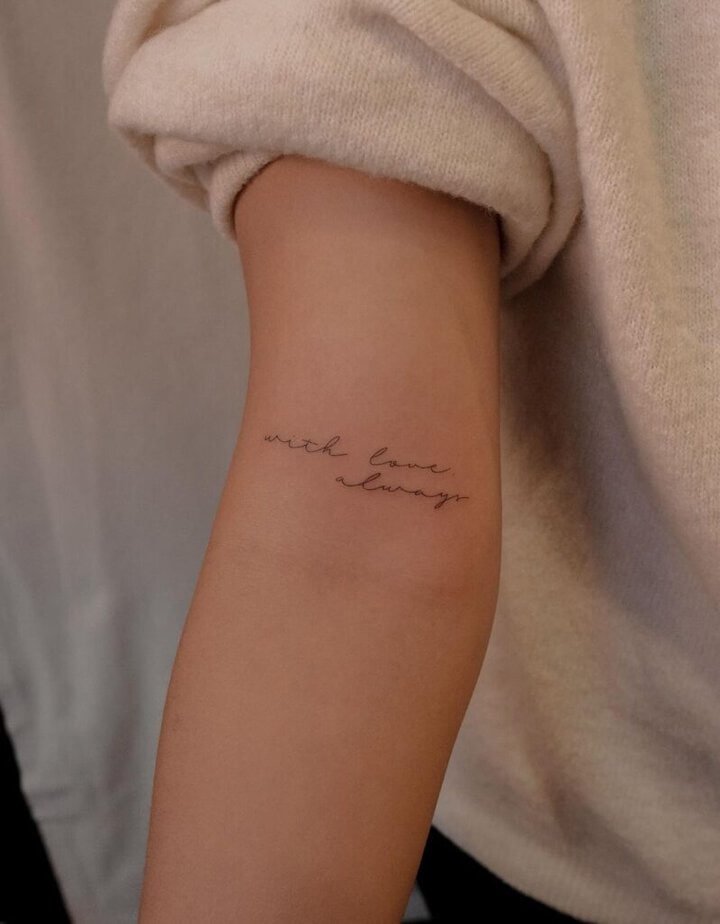 Script tattoos are like carrying a tiny motto or memory with you. Whether it’s a film quote, a line from a song, or a phrase that keeps you steady, fine script on the inside of the arm is personal and private unless you want to show it off.