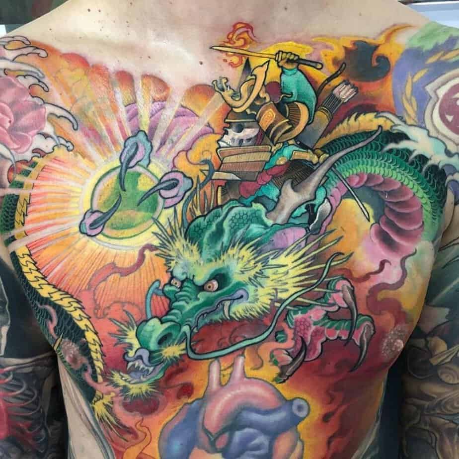 This green dragon breathes fire and turns everything around it red, and there’s even a mysterious rider on its back. Dragons bring that supernatural, mystical energy — choose this if you want your ink to feel otherworldly and strong.