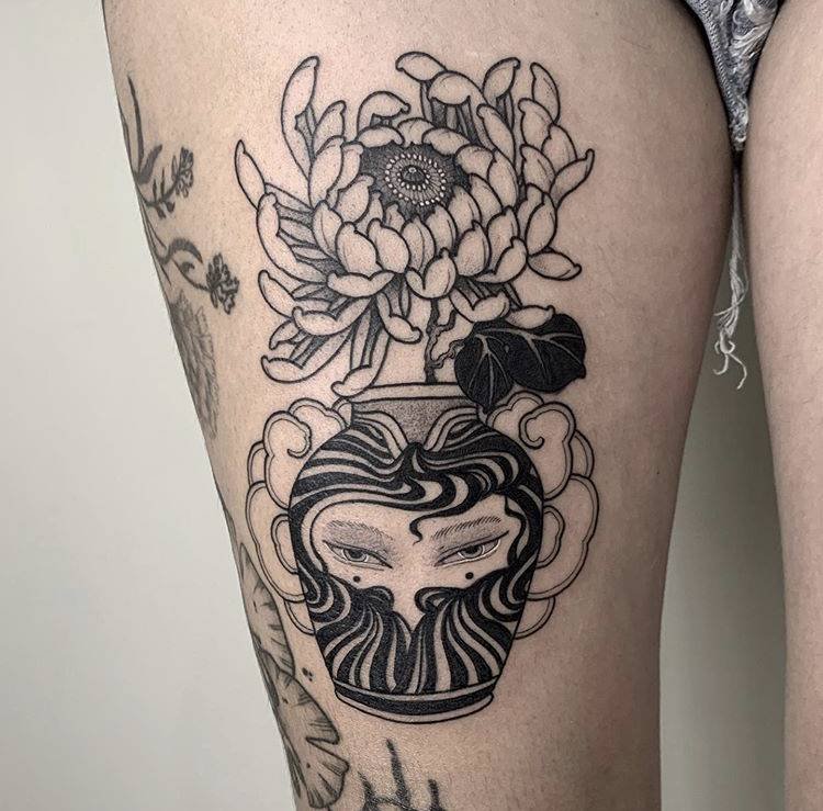 A kitsune in black and gray with pops of red and yellow sits on the thigh, and honestly, it’s the perfect choice if you like a little mystery. In folklore, foxes can become human — tricksters, shapeshifters, all that good mythic energy — so this one says, “I’m not telling everything about me,” in the best way. Sultry, secretive, and a touch magical.