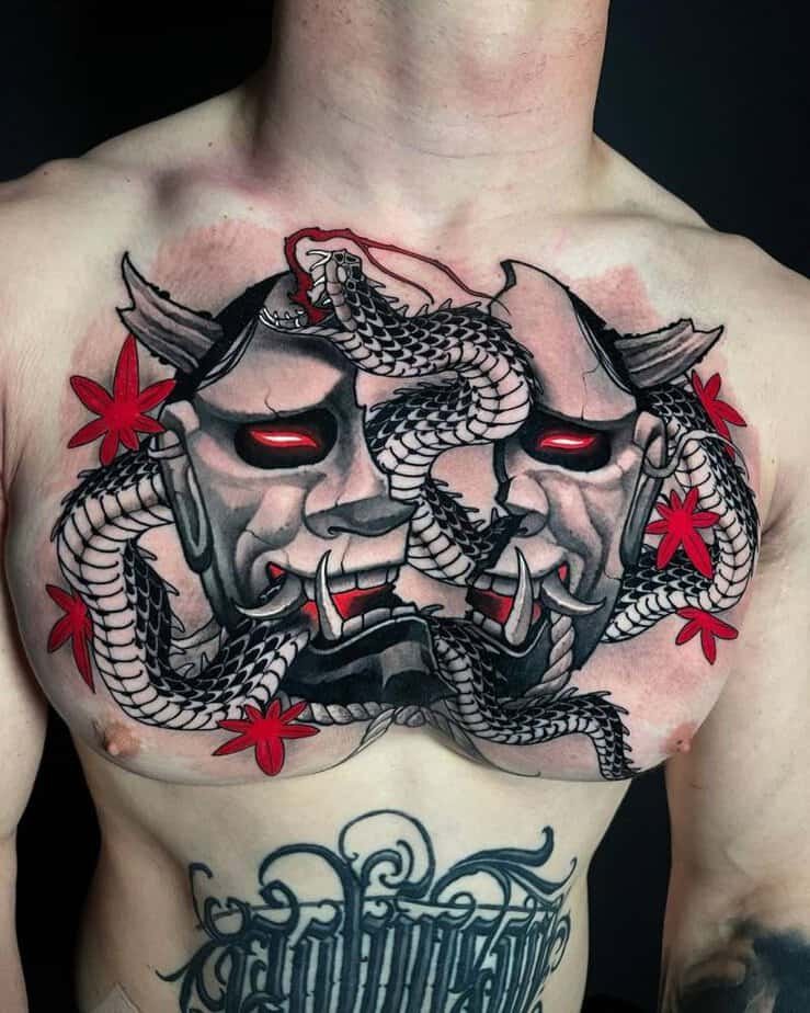 Here’s a chest piece that looks fierce at first glance: a shattered Hannya mask wrapped by a snake. The Hannya is all about anger and old wounds, but the cracks make it vulnerable, and the snake weaving through is change — transformation. It’s heavy in feeling but really beautiful, like a visual way to say you’ve been through something and you’re changing because of it.