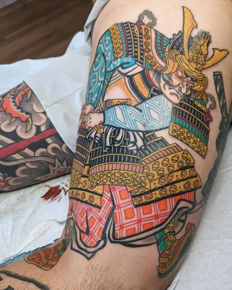 A vividly colored samurai on the arm, patterned armor and all, looks like something that’s ready to step off your skin. It’s about discipline, honor, devotion — the whole warrior vibe. If you want a visual that says you stand for something, this one does it well.