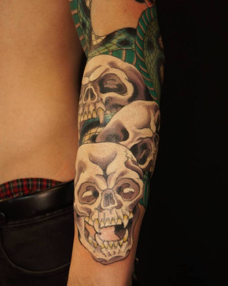 Three skulls tangled with a snake on a half-sleeve — visually heavy and rich in meaning. Skulls nod to mortality; the snake hints at renewal. Together they’re a reminder that endings often fold into new beginnings. Plus, it’s a dramatic look that holds its ground.