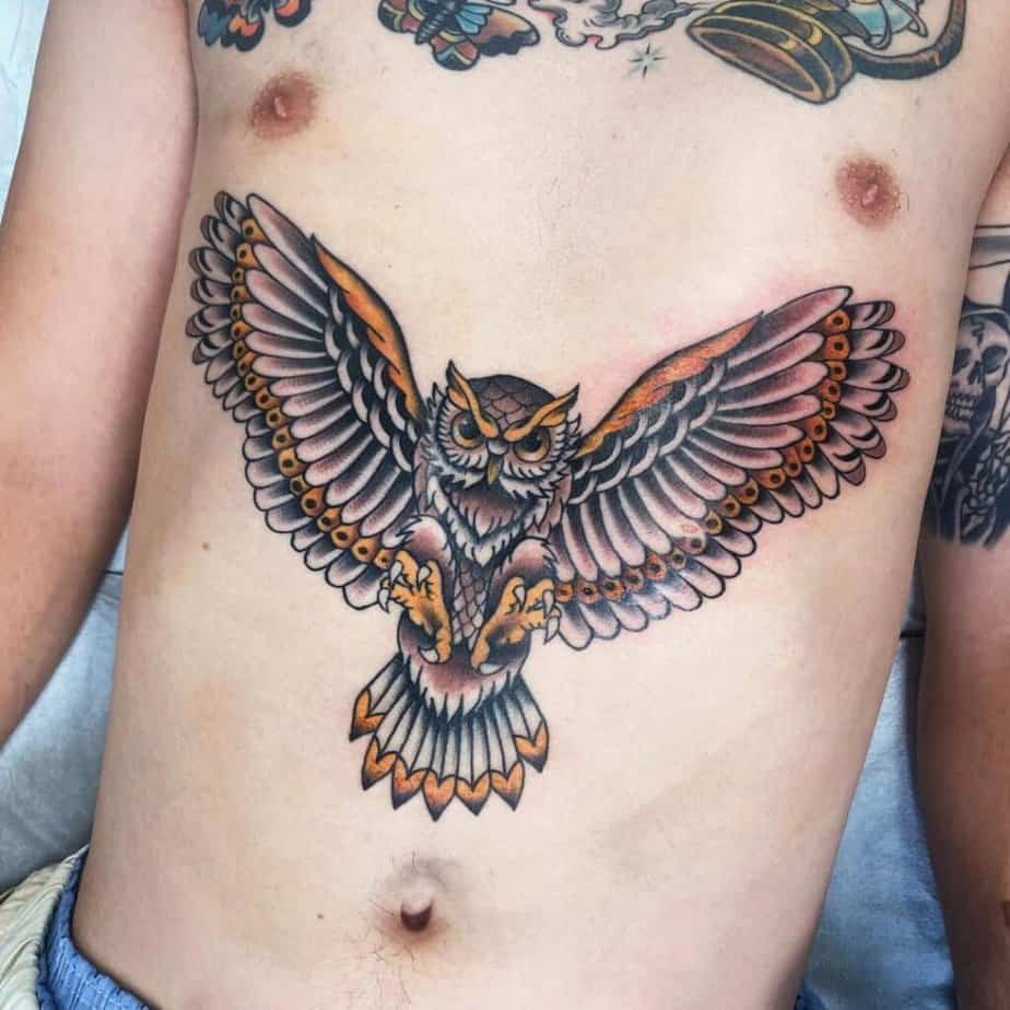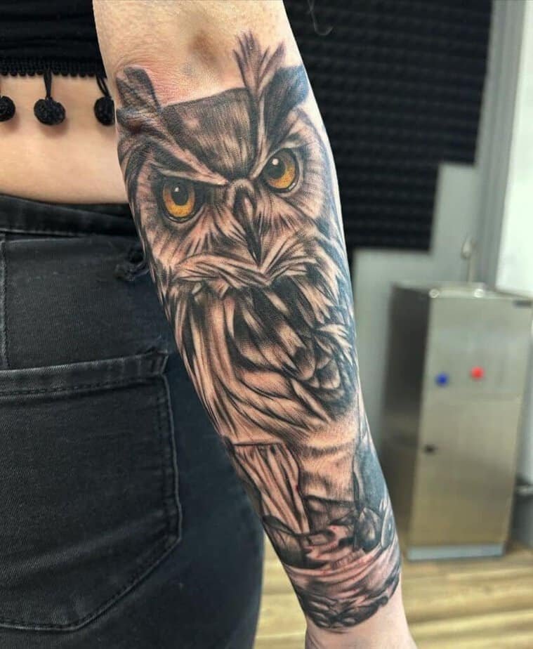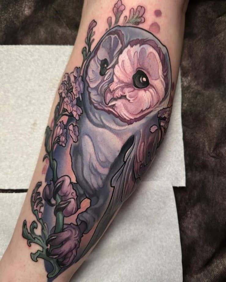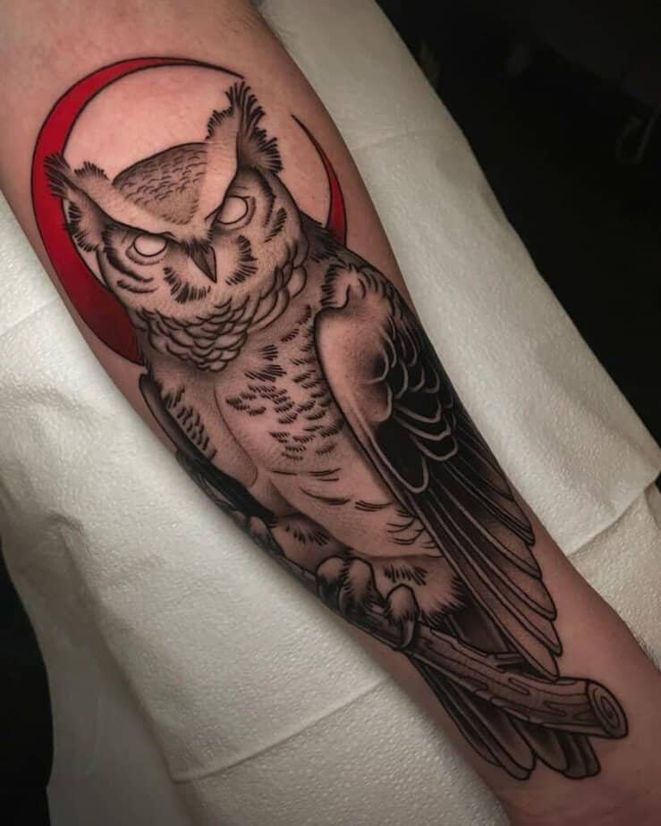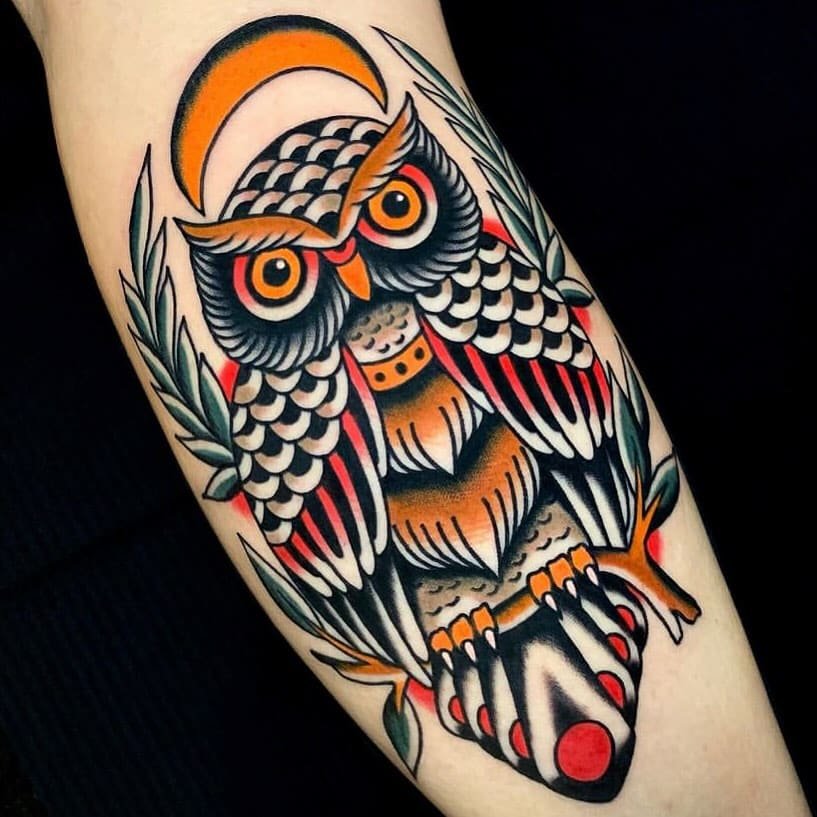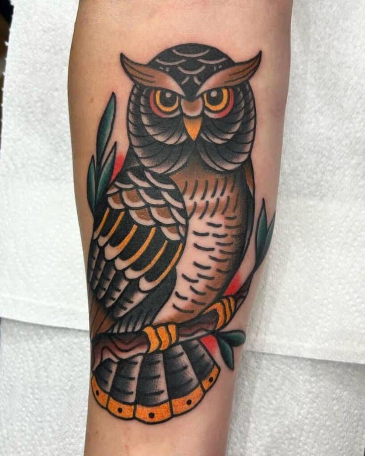 If you’re into thick outlines and bold colors, traditional style might be your jam. These owls have so much personality — the head shapes, the saturated fills, the way a branch or a splash of red can change the whole vibe. You can go big, like a chest piece that lets the wings spread out, or keep it darker and denser for a forearm wrap that flows down naturally. And hey, traditional tattoos are great for customizing: flowers, little red dots on a tail, whatever tiny easter eggs you want to tuck in. They read clearly from a distance, and they age like champs.
