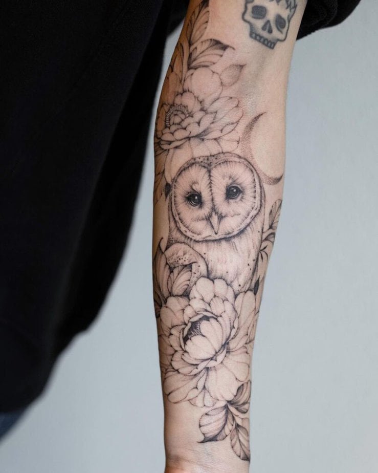 If you want your owl to read a little softer, add flowers. The owl stays the star, but blooms above and below can make the whole thing feel more feminine and balanced. Some designs keep the outlines light, avoiding heavy black shadows so the piece breathes, while others pair a black-and-gray owl with vividly colored, outline-free flowers for a beautiful contrast. You’re not limited to roses either — wildflowers or delicate sprigs can give your familiar a unique story, and tiny tattoos can pack surprising texture with minimal linework. The faces in some of these are genuinely hypnotic, like that moment when it feels the owl is looking straight into you.