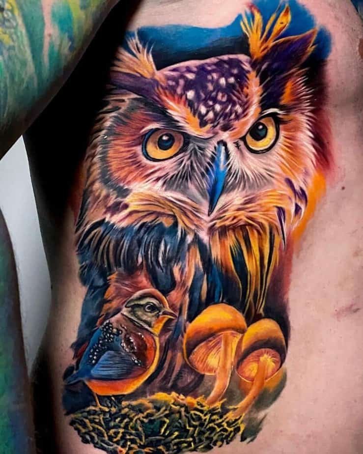 Don’t be afraid to splash color in there — watercolor owls are so dreamy. Flowers and leaves can anchor the piece while washes of color make the owl feel illuminated, like a soft light at night. Some of these designs skip dark outlines entirely, relying on color gradients and texture to define shape, which gives a really gentle, painterly vibe. And if you want vibrant magic, throw in moons, stars, and contrasting leaves — it’ll read mystical and joyous at the same time.