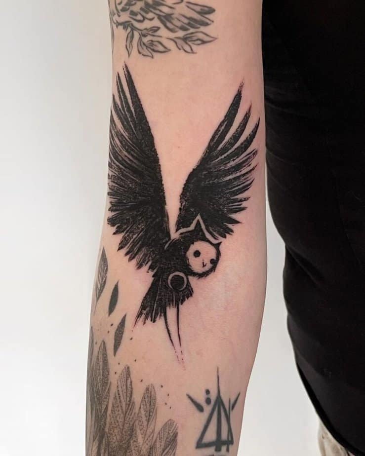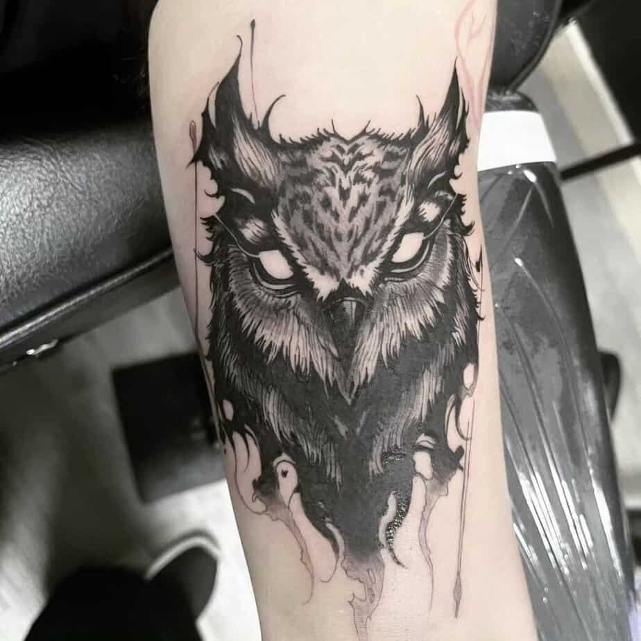 Okay, now for the fun part — the designs that break every rule. Some of these are adorable-cute-but-also-unsettling, with heavy blacks so they last forever and edges that fade into ghostly wisps. Others ditch the natural look entirely: think owls with four eyes, or blank, hollow sockets that give a haunting energy. There are pieces that mix mandala geometry with owl symbolism for a full-on spiritual vibe — the eyes pop with color while the rest stays monochrome, and you find new details the longer you look. And then there are simple, minimalist but eerie designs with a saturated red moon that just slaps.