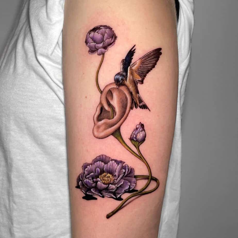 This one’s delightfully weird and wonderful: a purple peony, a sparrow, and even a human ear. The colors are rich and the bird’s realistic detail contrasts with the surreal ear — it’s bold conversation-starter territory, perfect if you love art that sparks questions.