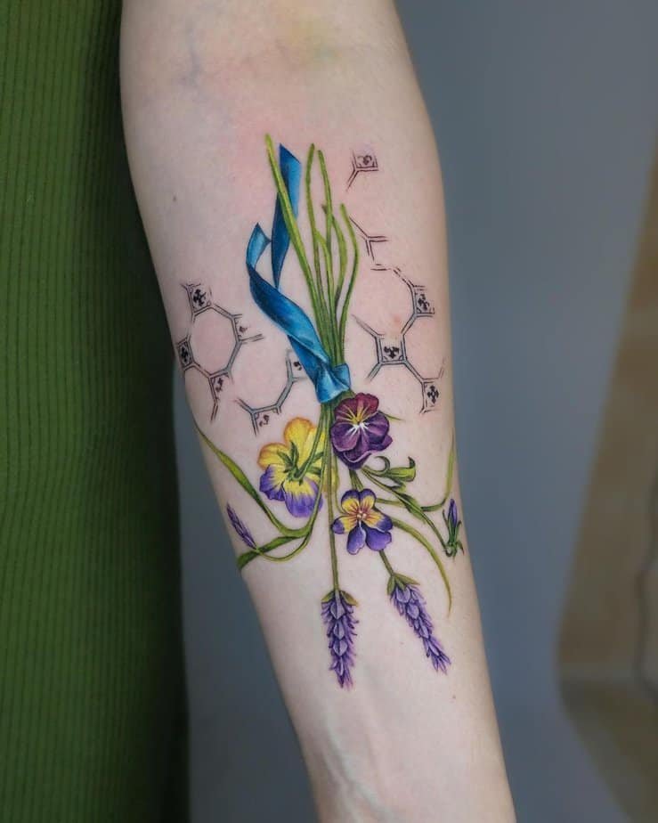 Imagine a mini garden wrapped in a ribbon on your arm — that’s this design. Pansies, lavender, tiny textures and delicate shading give each bloom its own personality, and the ribbon ties the whole thing together in the sweetest way. It’s perfect if you can’t pick a single favorite and want a playful mix instead.