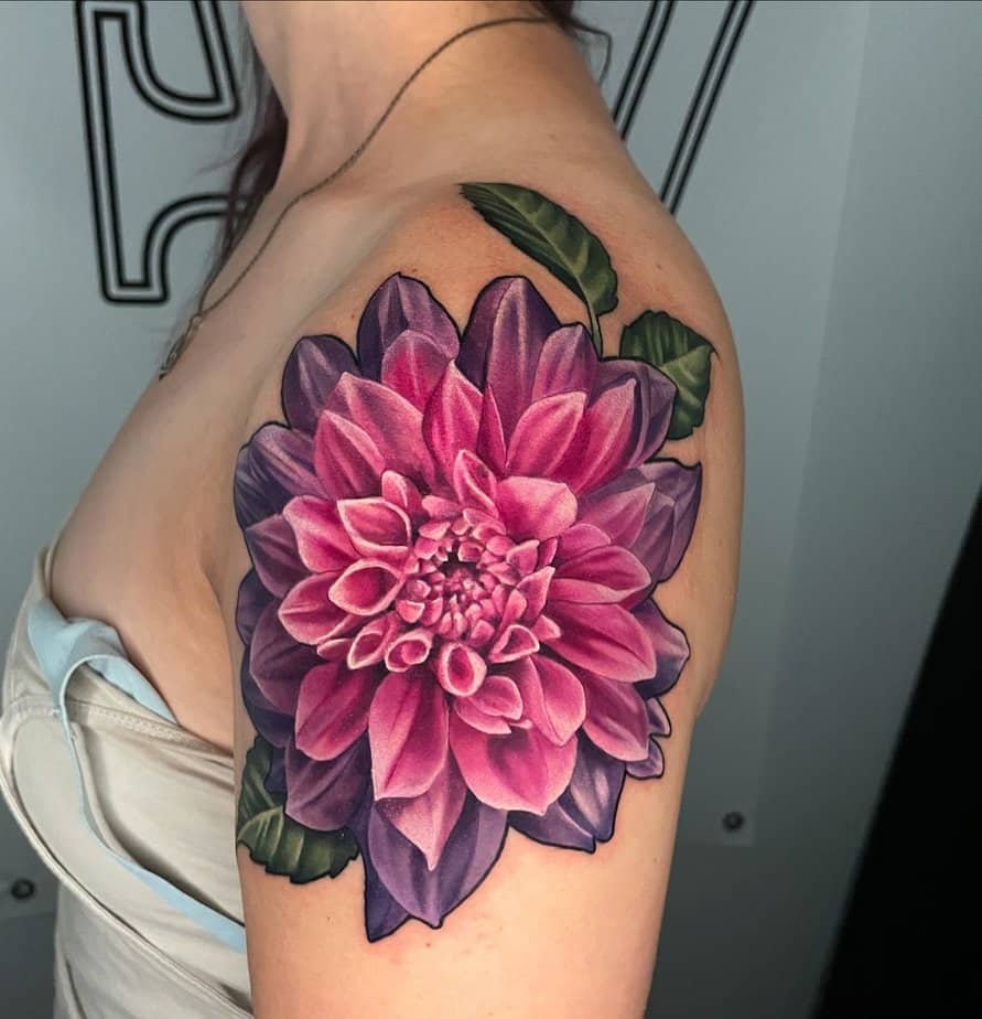 A giant dahlia that owns the shoulder