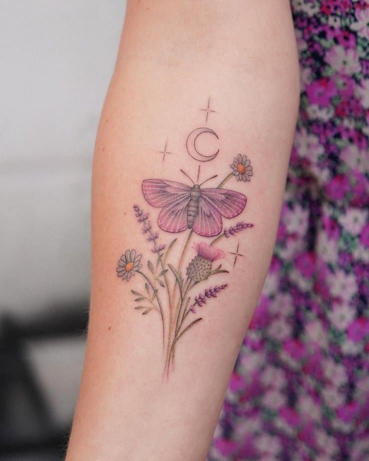 This design wraps up the forearm like a gentle story — each tiny flower has its own character, with fading purples that pull the whole piece together. It reads like growth and transformation, very fairy-tale and very suited for dreamers who want something flowing and organic.