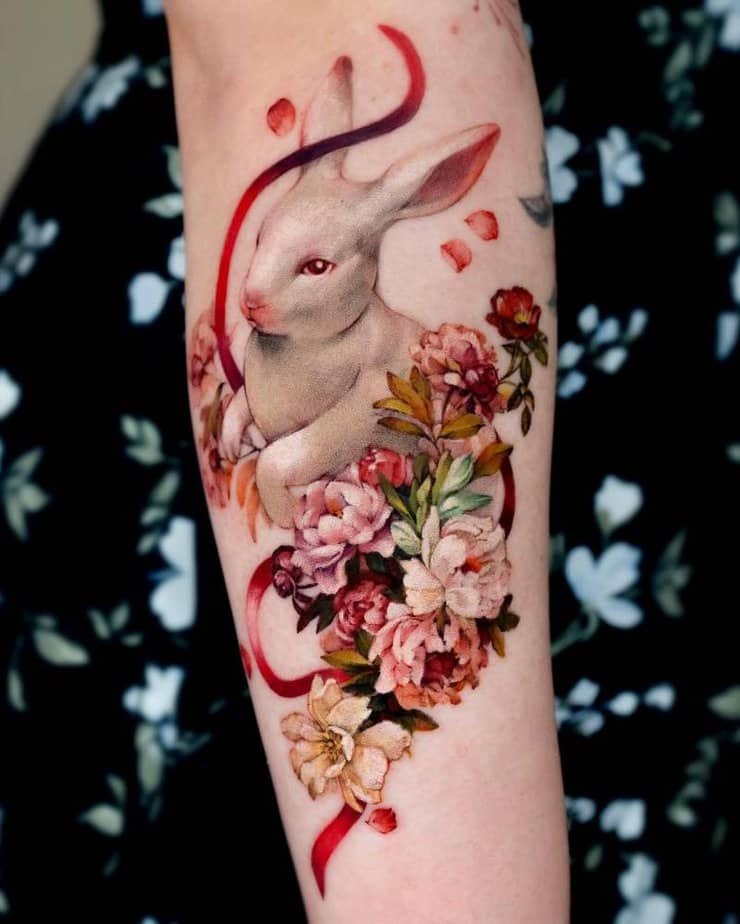 This forearm piece has a tiny bunny with red eyes peeking out from a tangle of blooms and a red string, and honestly, it’s so endearing. The reds bring warmth and affection, while the bunny adds a playful, feminine energy — like a little secret you carry with you.