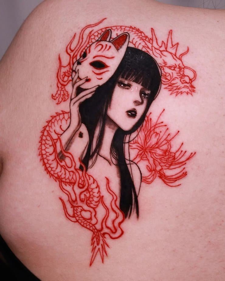 You know those kitsune fox stories where the trickster punishes the wicked? Imagine pairing that sly fox energy with a red dragon and suddenly your tattoo reads like a comic-book justice code. It’s for people who see the world as a little broken and want to help fix it — or at least look ready to. If you get this, let it be your tiny reminder that you’re stronger than you feel on the soft days.