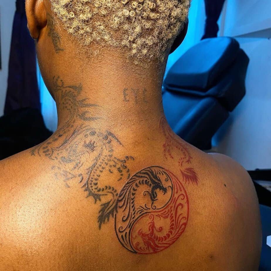 Shoulder tattoos just look cool, and this one has extra symbolism with the red sun. For me, it feels like the dragon transforming the sun itself — dramatic, poetic, and visually bold. The black accents give it a gorgeous contrast that makes everything pop.
