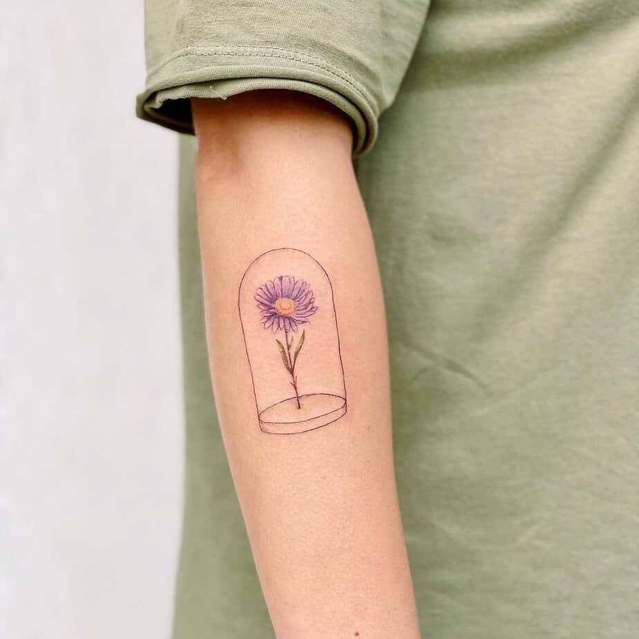 A purple aster tucked inside a glass dome gives major storybook energy. Purple asters are a symbol of unconditional love, and the dome reads as protection — like the idea of caring for something precious. If you want a tattoo that’s romantic but thoughtful, this one feels like a quiet promise.