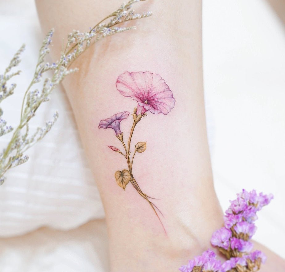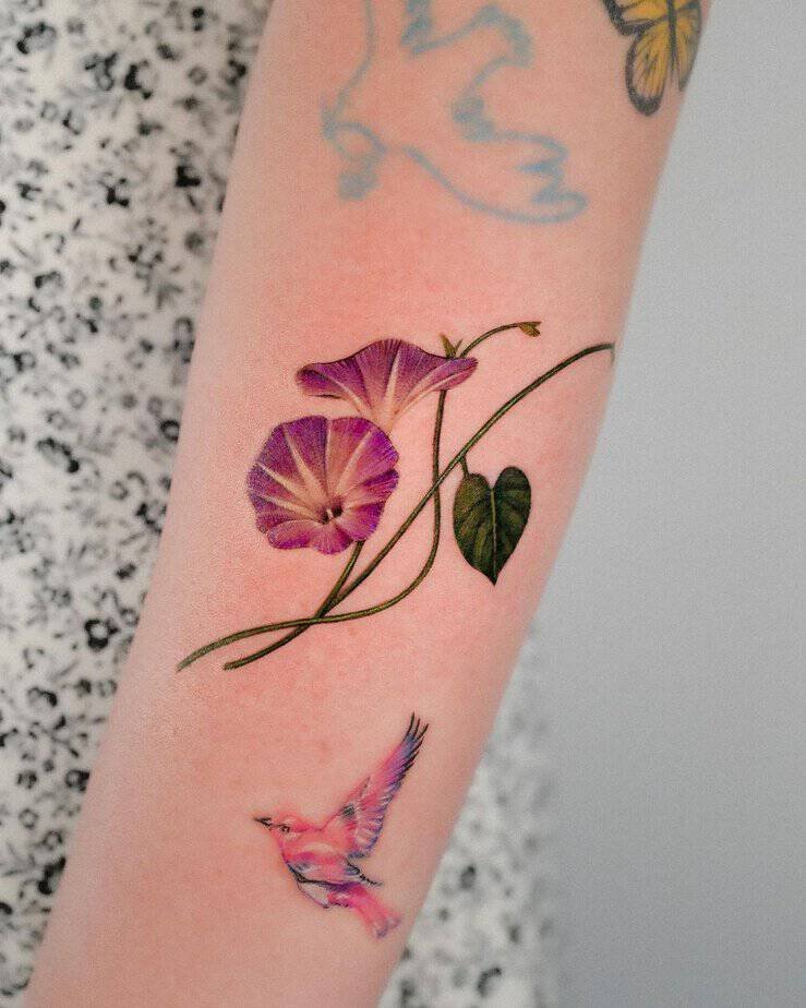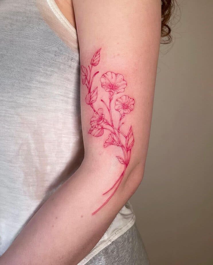 Imagine a morning glory winding from upper arm to forearm in fiery red — very eye-catching and very romantic. The red brings a passionate energy, so it’s perfect if you want your tattoo to speak about true love or a love you don’t hide. It’s bold, sweet, and a little bit daring — go ahead, wear your heart on your sleeve (literally).