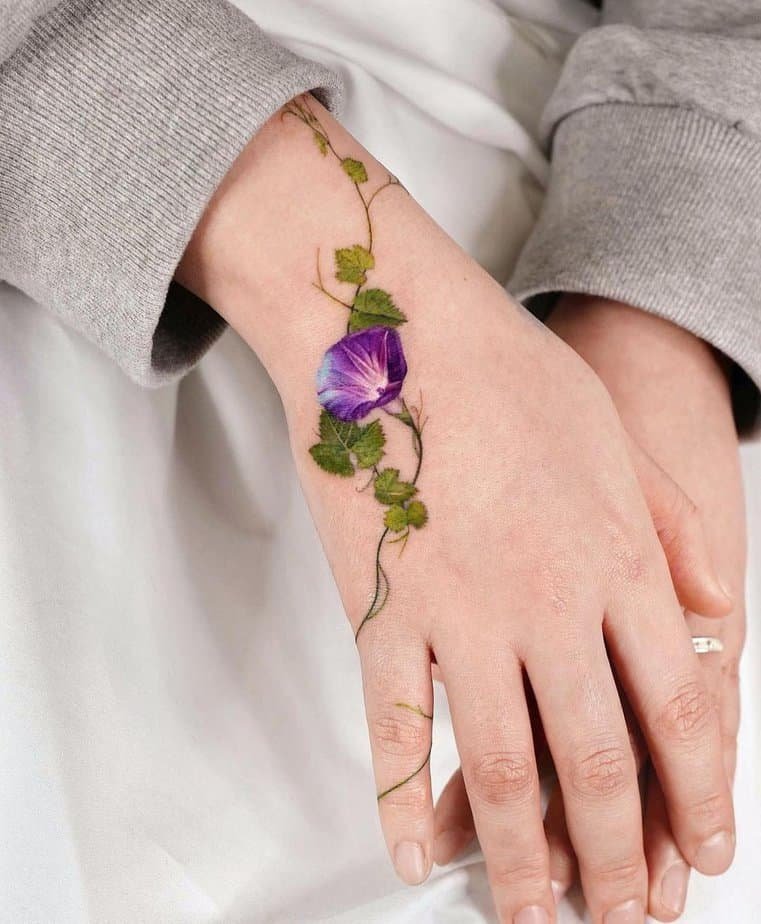 A realistic morning glory on the hand is a bold choice and it looks beautiful — bright, intricate, and slightly mysterious. If you want attention and artistry, this placement does the job.