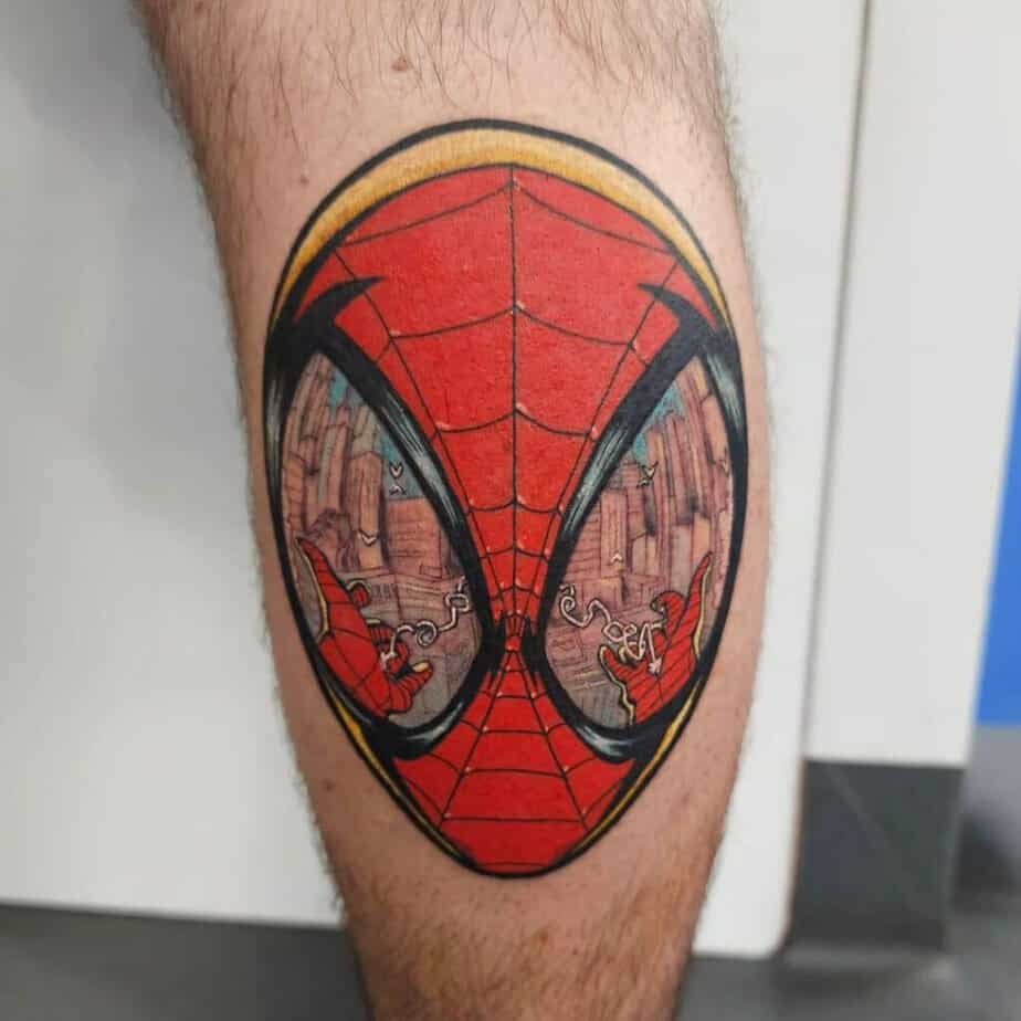 Leg tattoos are great because they give you room — especially the thigh, which is basically a canvas. One favorite motif is spider-sense imagery: an upside-down Spidey, poised and ready, which captures that whole superhero energy. If you swing more punk, there are versions that take the character into grungy, rebellious territory — totally different feel but so cool if you want something edge-y.