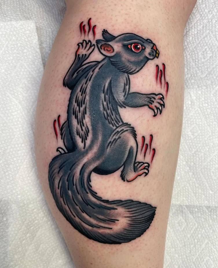 This leg tattoo turns the squirrel into a tiny champion: cape, sword, and attitude. The black-and-gray work brings out the texture of fur and armor, and the overall vibe is fantastical and brave — unexpected and awesome.