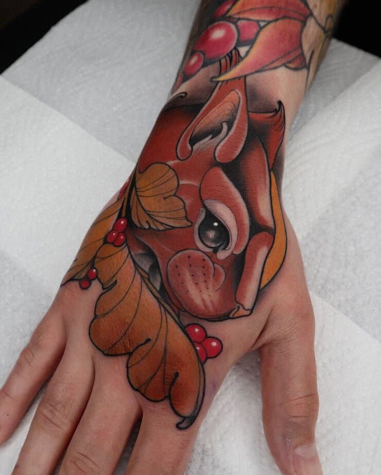 Picture a squirrel on your forearm, holding a single bloom like a shy gift — it’s adorable. This one’s colorful and whimsical, the kind of tattoo that makes people smile and that you’ll love looking at during slow afternoons.