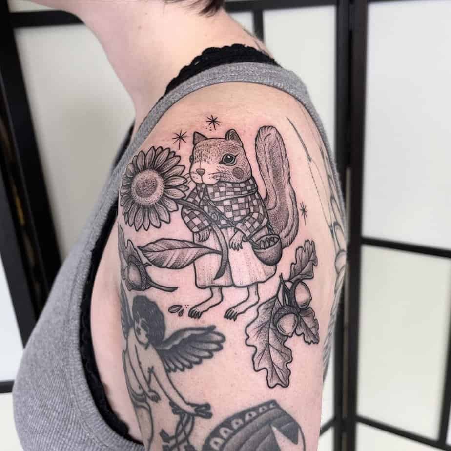 Imagine a squirrel in cute casual clothes, clutching a sunflower like it’s ready to brighten someone’s day. This upper-arm design radiates positivity and feels like a wearable reminder to face things cheerfully.