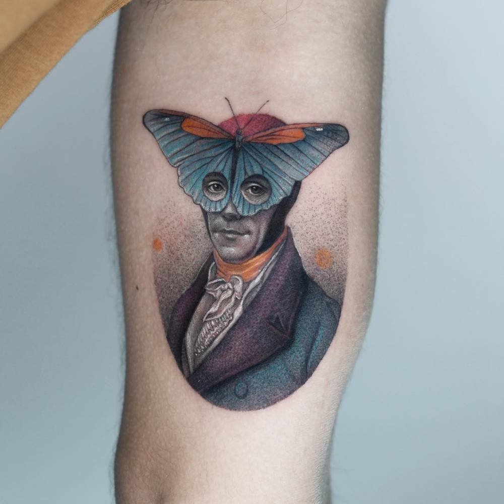 This shin tattoo blends color with dotwork and puts a human figure wrapped in butterfly imagery front and center. The human side nods to experience; the butterfly is transformation — a gentle push to lean into growth.