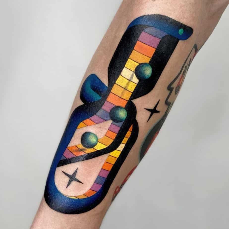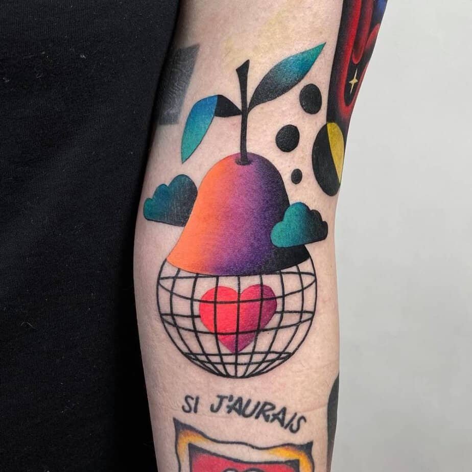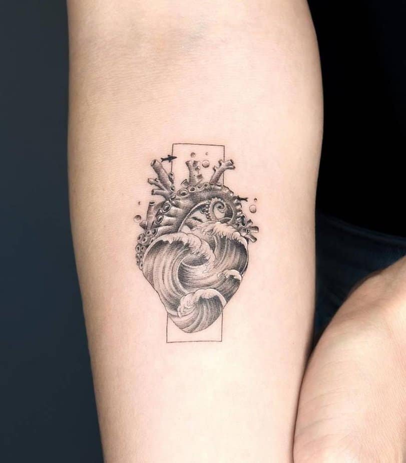This forearm piece tucks a wave-shaped heart into a geometric frame with lovely dotwork details. The mash-up says relationships are beautiful but unpredictable — there’s motion, patience, and a reminder to stay steady even when things shift.