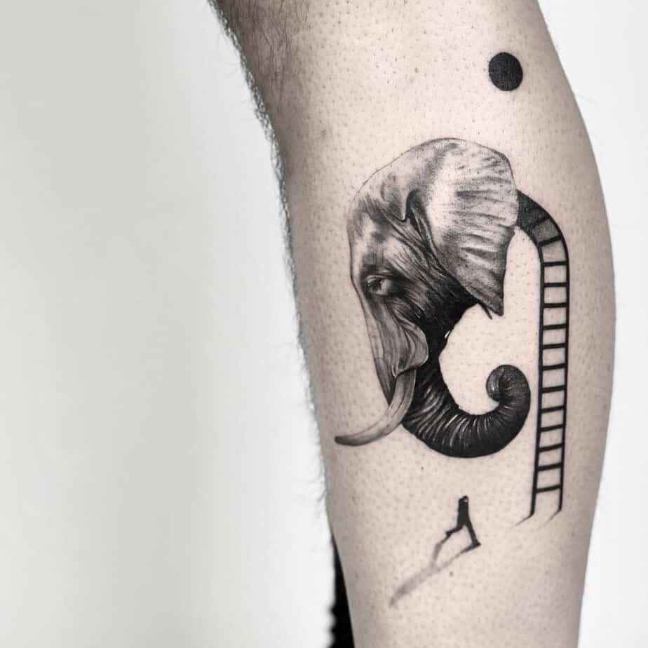 This surreal scene of a ladder up an elephant feels like a metaphor for growing up with your past in tow. The elephant for memory, the ladder for the climb — together they say: celebrate where you started while you keep moving upward.