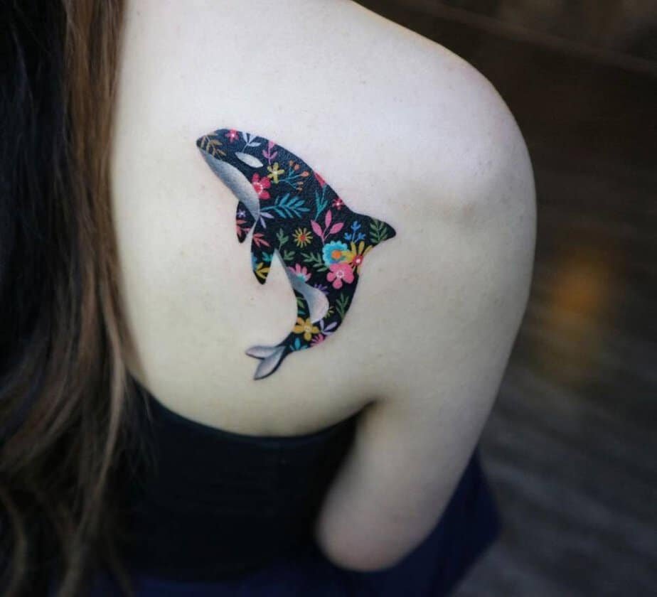 A colorful upper-back piece where an elegant orca swims amid a crown of flowers. It’s that sweet tension between raw power and delicate beauty — nature’s muscle wrapped in petals.