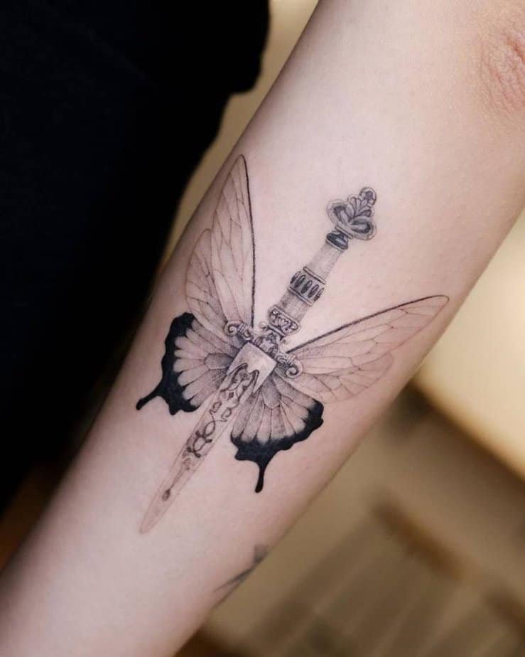Black-and-gray tones with a lyrical twist: a sword interlaced with a butterfly. Strength and purpose paired with freedom and aspiration — a visual reminder to pursue something meaningful without losing your lightness.