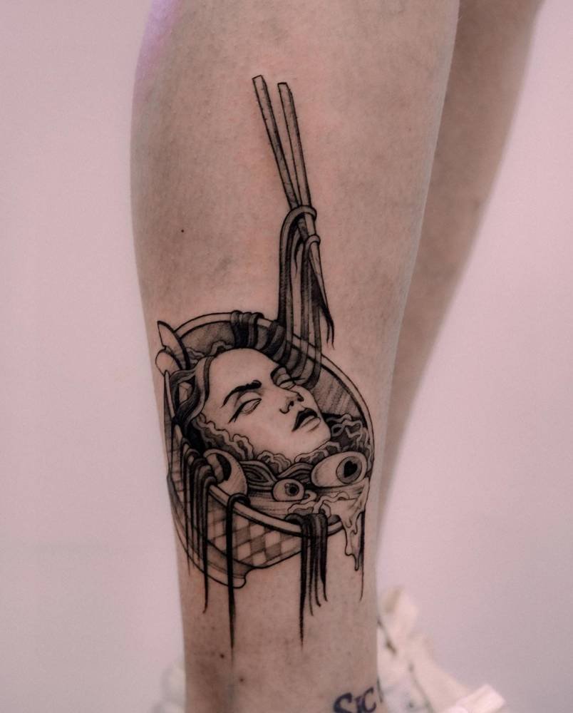 Calf placement, playful presentation, but also thoughtful symbolism: ramen for finding beauty in the simple things, a head for the complexity of mind and feeling. Together it’s like saying the everyday can hold whole worlds if you let it.