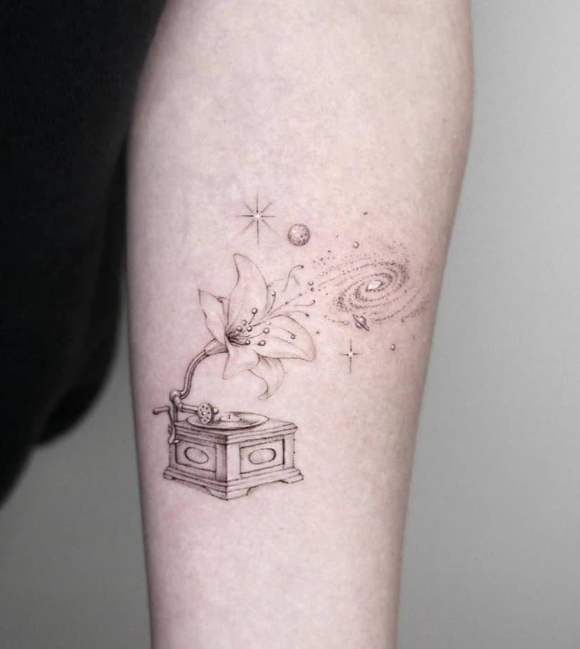 This upper-arm piece is delightfully nostalgic: an old gramophone with a lily growing out of it, little stars and planets twinkling around. It reads like a love letter to transformation — the gramophone is all about memory and the past, and the lily says things can change into something quieter and beautiful.