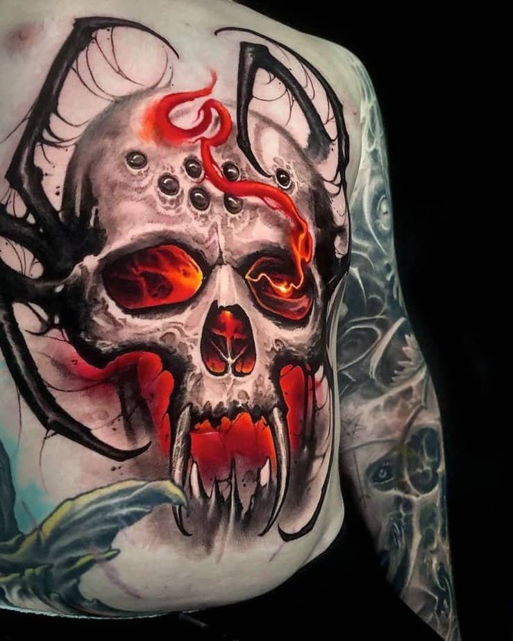 Full-chest drama: a skull threaded with spider motifs and inner flames. The skull reminds you life is short; the spider whispers about creativity and webbed complex thinking. It’s a nudge to honor your creative fire while you can.