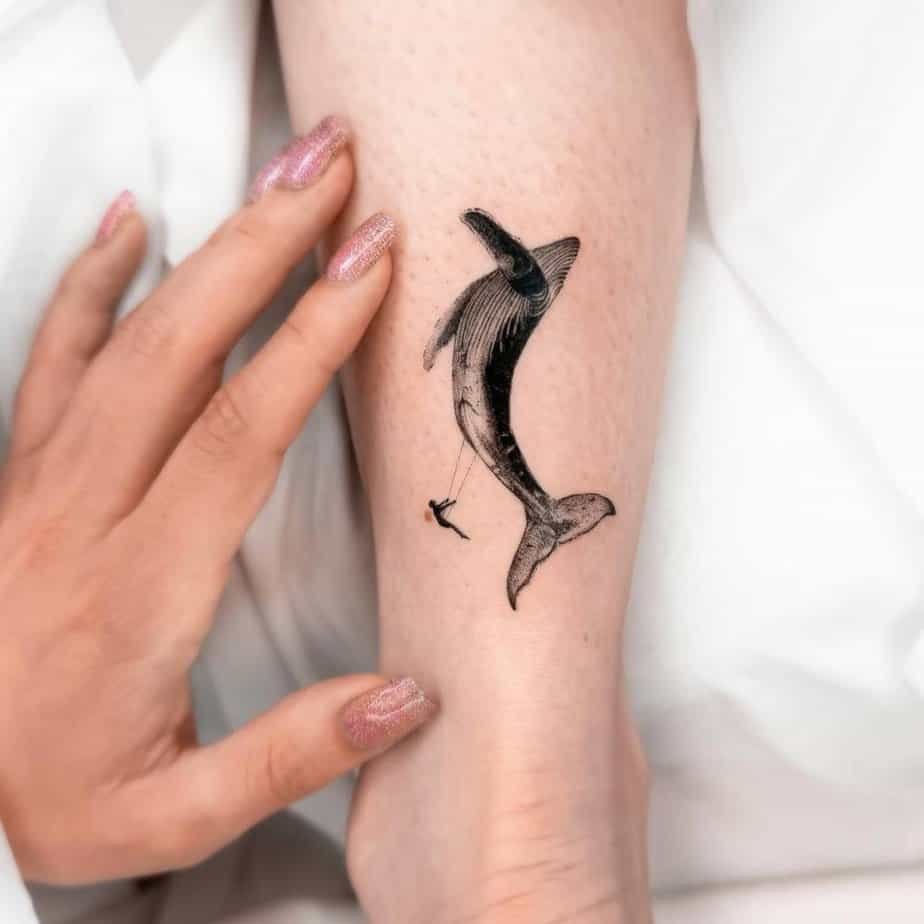 This shin piece mixes blackwork and dotwork in a way that feels both delicate and bold. Imagine a whale and a trapeze artist performing together — the whale brings the depth and vastness, the trapeze artist brings freedom and bravery. Put them together and you get a reminder to be brave enough to dive deep when something meaningful calls.