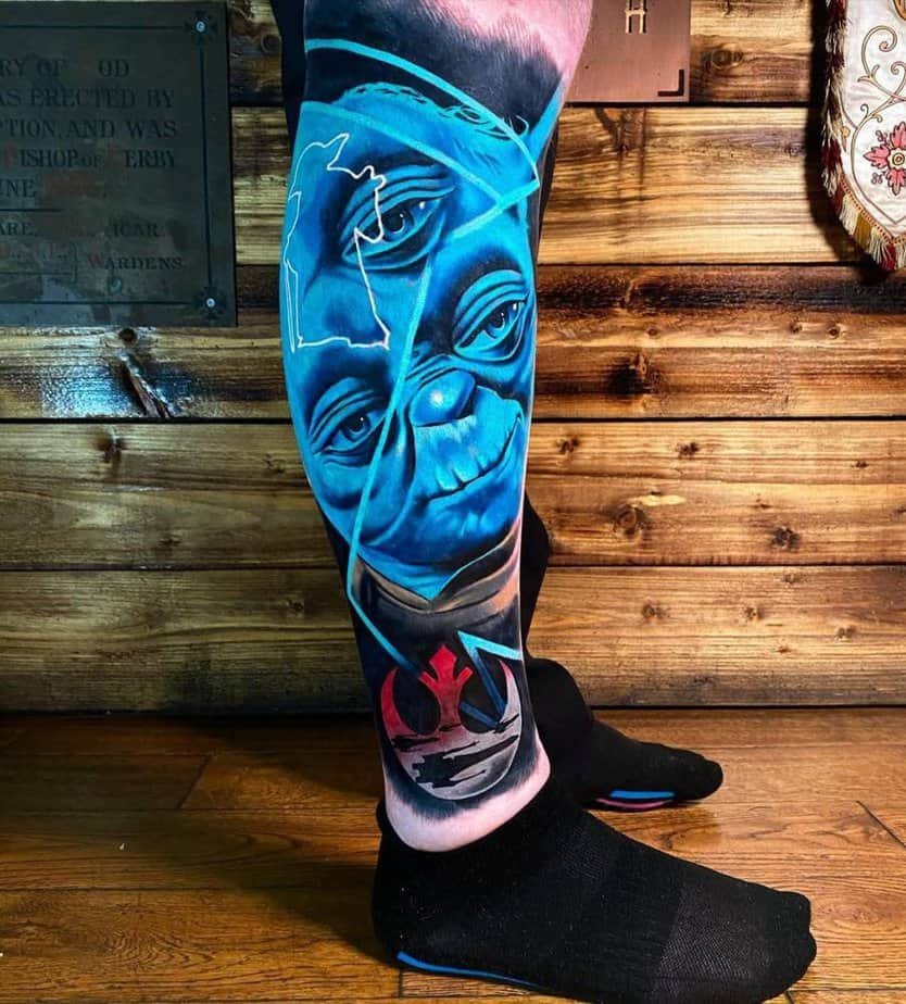 A blue Yoda portrait — wisdom as body art