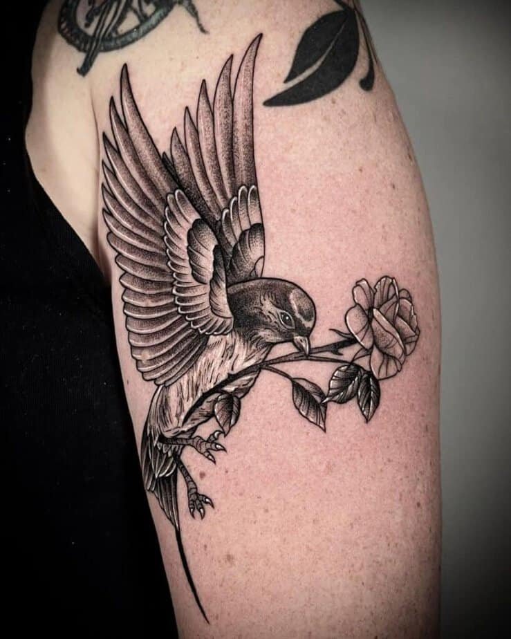 Want to honor someone? A swallow carrying a rose is a tender, unique way to do it — romantic and nostalgic without being obvious.