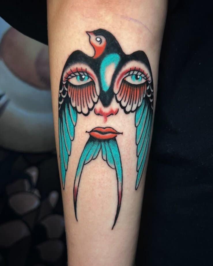 These flashy hues are perfect for an arm or an area you want to show off. If two birds feel too much, one vibrant swallow still steals the scene.