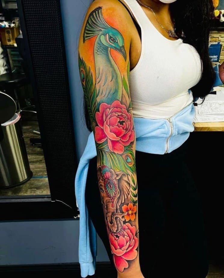 Animals bring symbolism — peacocks for beauty, elephants for memory and strength — and when you pair them with flowers, you get a sleeve that feels personal and meaningful. Swap in animals that mean something special to you and it becomes yours instantly.
