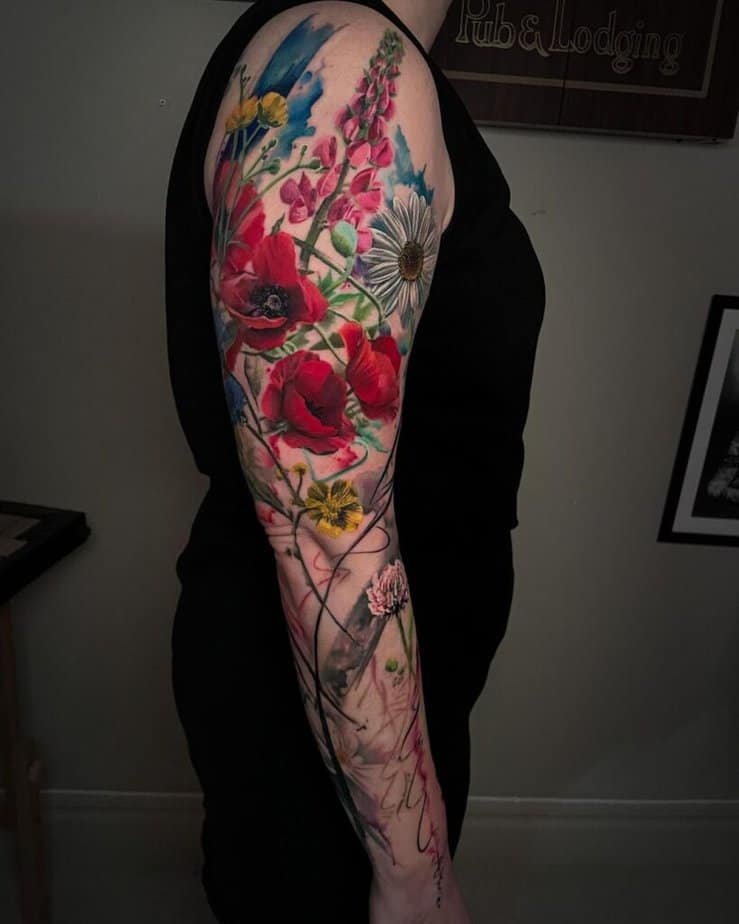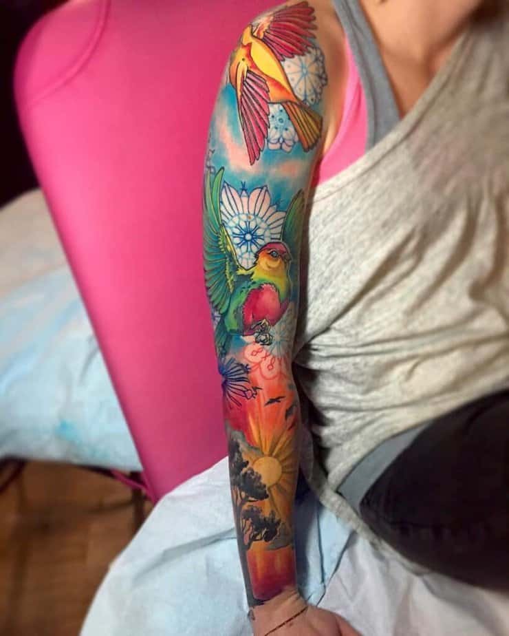 A colorful garden sleeve is joyful and unabashedly feminine — think blooms layered with leaves and butterflies, all in vivid shades that read like a summer day on your arm.