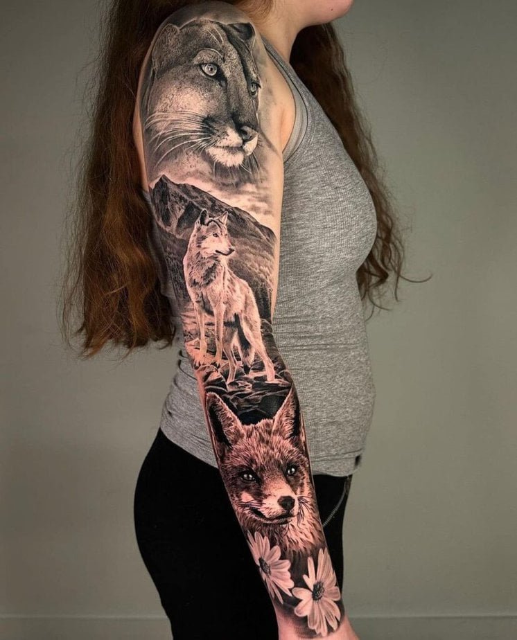 If animals are a deep part of your story, build a sleeve around them. It’s personal, symbolic, and every glance at your arm can feel like a quiet nod to the creatures that matter to you.