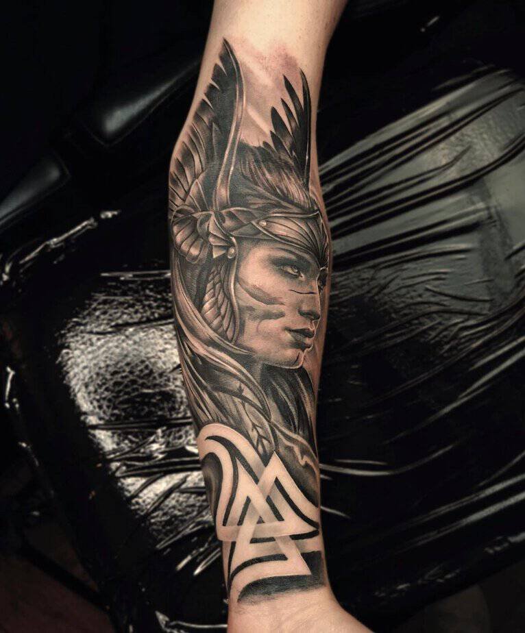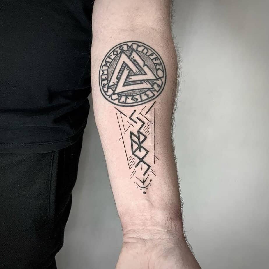 If you want something clean that still makes people pause, a small forearm Valknut in heavy blackwork does the job. It’s compact but fierce. In Viking lore the interlocking triangles — sometimes called Odin’s knot — hint at Odin’s power over fate. So wearing it on your forearm can feel like a little reminder: destiny’s part mystery, part story you live through.